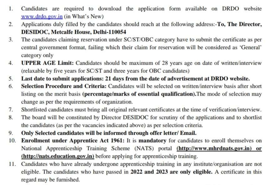 Defense Research & Development Organization (DRDO) నుండి విడుదలయిన ఈ Apprentice ఉద్యోగాలకు ఎటువంటి రాత పరీక్ష లేకుండా డైరెక్ట్ సెలక్షన్ చేసి మెరిట్ మార్కుల ఆధారంగా జాబ్స్ ఇస్తారు.