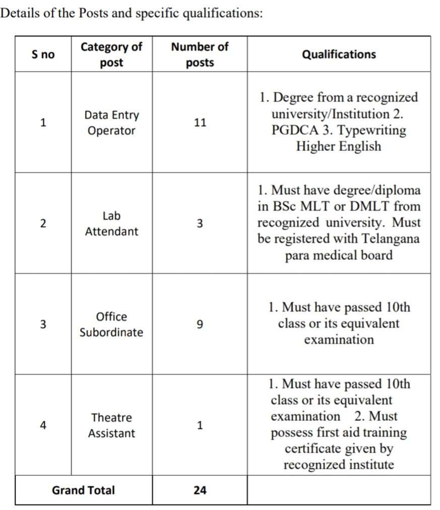 తెలంగాణాలోని అవుట్ సోర్సింగ్ డిపార్ట్మెంట్ కింద ఉన్న 24 Office Subordinate, Computer Operator, Theatre Assistant, Lab Attendar ఇతర పోస్టులను ఎటువంటి రాత పరీక్ష, ఫీజు లేకుండా డైరెక్ట్ మేరీట్ మార్కుల ఆధారంగా సెలక్షన్ చేసి జాబ్స్ ఇస్తారు.