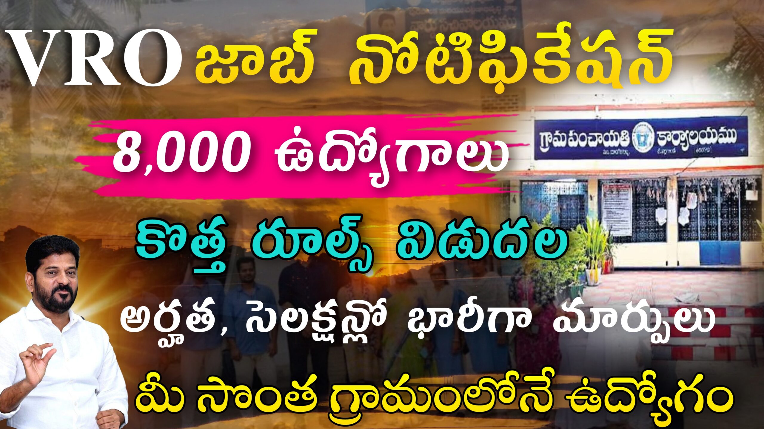 తెలంగాణా భూమి హక్కులు పట్టాదారు పాసు పుస్తకం చట్టం – 2024 కు సంబందించి తెలంగాణా రాష్ట్రంలో భూమి వివాదలకు పరిష్కారం లభించే విధంగా అసెంబ్లీ బిల్ ప్రవేశ పెట్టి కొత్తగా నియమ నిబంధనలు తీసుకొనివస్తున్నారు. ఈ బిల్ పాసయ్యాక ధనికనుగుణంగా పనులు చేయడానికి భారీగా VRO ల అవసరం ఎంతైనా ఉంటుందని ప్రభుత్వం భారీ స్థాయిలో 8,000+ పోస్టులతో నోటిఫికేషన్ జారీ చేయాలనీ భావిస్తోంది.