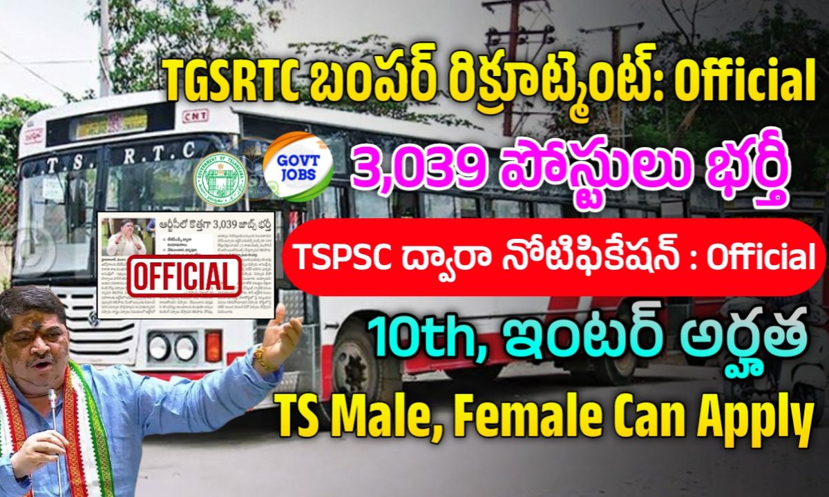 తెలంగాణా రాష్ట్ర రోడ్డు రవాణా సంస్థలో ఖాళీగా ఉన్న 3,039 ఉద్యోగాలను తెలంగాణా పబ్లిక్ సర్వీస్ కమిషన్ ద్వారా భర్తీ చేస్తామని అసెంబ్లీ సాక్షిగా తెలంగాణా రవాణా శాఖ మంత్రి పొన్నం ప్రభాకర్ తెలిపారు. త్వరలో నోటిఫికేషన్ విడుదల చేసి Rtc లో ఖాళీగా ఉన్న పోస్టులను భర్తీ చేస్తామని వివరణ ఇవ్వడం జరిగింది. RTC లో మొత్తం 3,039 పోస్టులలో డ్రైవర్, శ్రామిక్, సూపరింటెండెంట్, ఇతర పోస్టులు ఉన్నాయి. 18 నుండి 44 సంవత్సరాల మధ్య వయస్సు కలిగి 10th, ఇంటర్, డిగ్రీ అర్హత కలిగిన అభ్యర్థులు దరఖాస్తు చేసుకోవచ్చు. రిక్రూట్మెంట్ పూర్తి వివరాలు చూసి తెలుసుకోగలరు.