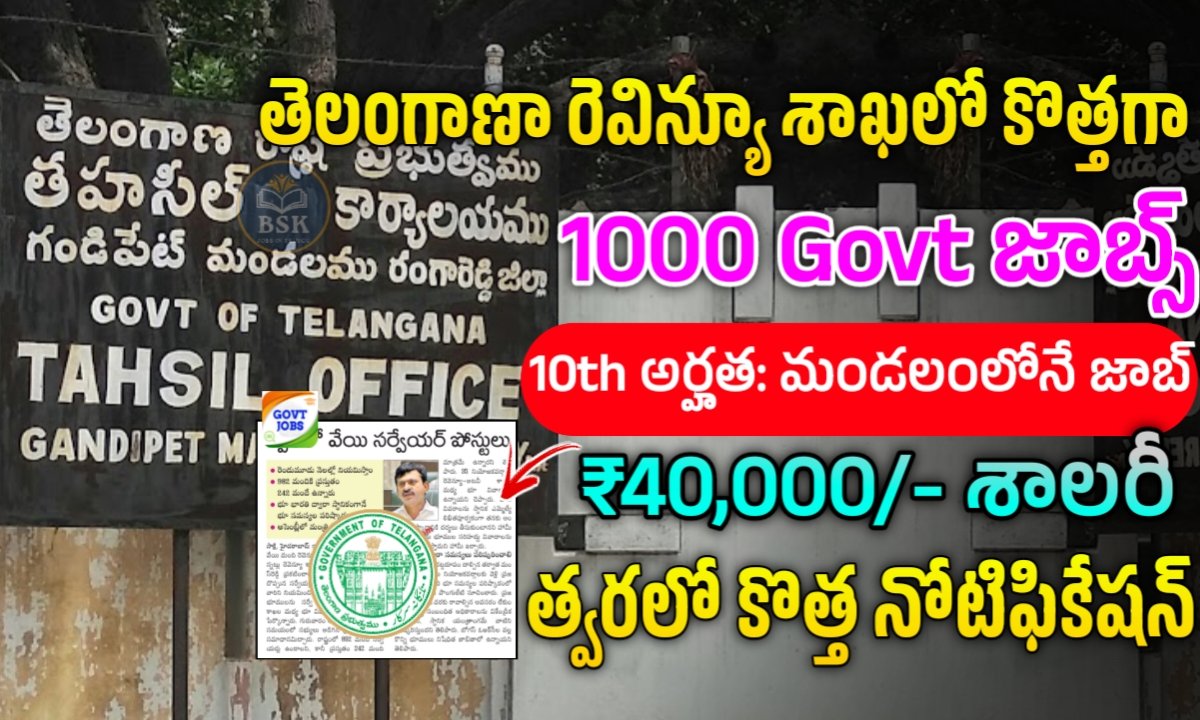 తెలంగాణా రెవిన్యూ డిపార్ట్మెంట్ లో ఖాళీగా 1000 రెవెన్యూ సర్వేయర్ పోస్టులను భర్తీ చేస్తామని రాష్ట్ర మంత్రి పొంగులేటి శ్రీనివాస్ రెడ్డి అసెంబ్లీలో ప్రకటించారు.ఈ పోస్టులకు Apply చెయ్యాలి అంటే అభ్యర్థులకు 10th అర్హతతో పాటు నేషనల్ కౌన్సిల్ ఆఫ్ ఒకేషనల్ ట్రైనింగ్ సర్టిఫికెట్స్ డ్రాట్స్మ్యాన్ సివిల్ ట్రేడ్ లో సర్టిఫికెట్స్ కలిగినవారు దరఖాస్తు చేసుకోగలరు.