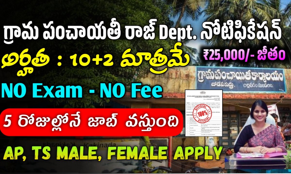 6 నెలలు కాంట్రాక్టు కాలానికి పనిచేయడానికి గ్రామీణాభివృద్ధి మరియు పంచాయతీ రాజ్ శాఖ నుండి 04 జూనియర్ ప్రాజెక్ట్ సైంటిస్ట్, 02 డేటా ఎంట్రీ ఆపరేటర్ ఉద్యోగాలకు నోటిఫికేషన్ జారీ చేశారు. 10+2, MTECH, MSC, BTECH అర్హతలు కలిగినవారు దరఖాస్తు చేసుకోవాలి.