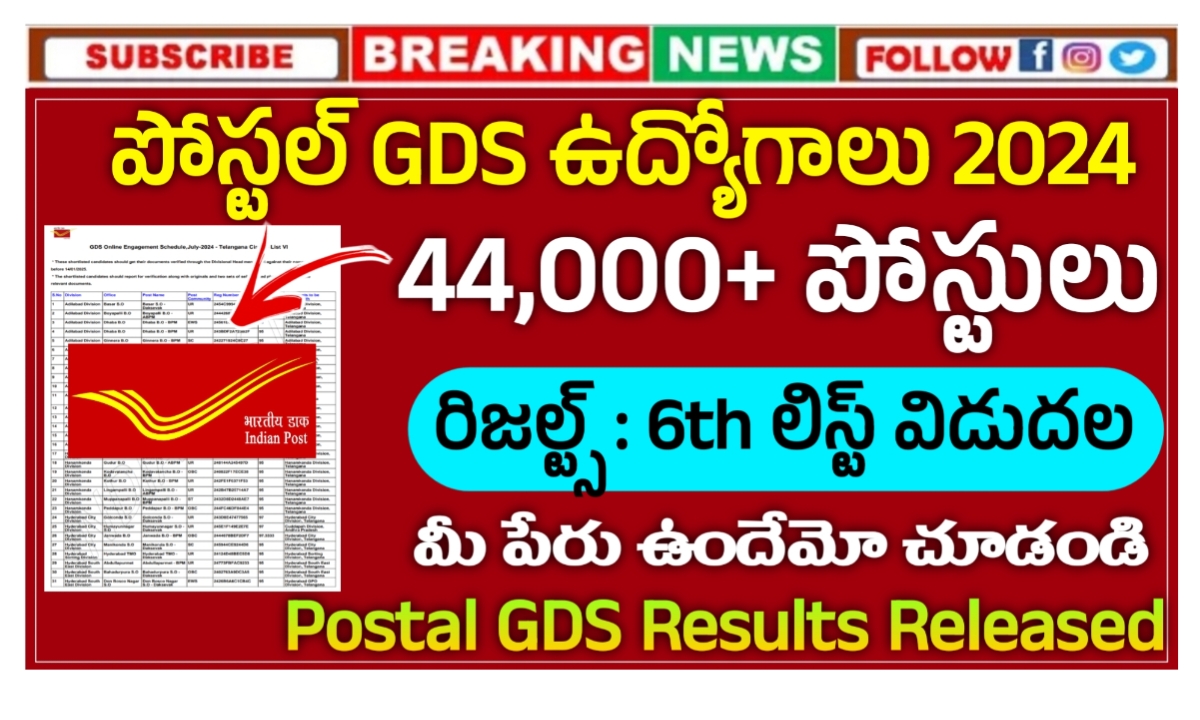 2024 జూలైలో విడుదలయిన పోస్టల్ గ్రామీణ డాక్ సేవక్ 44,000+ ఉద్యోగాల 6th రిజల్ట్స్ లిస్ట్ అధికారికంగా విడుదల చేశారు. ఈ ఉద్యోగాలకు 10th క్లాస్ అర్హత కలిగి 18 నుండి 40 సంవత్సరాల మధ్య వయస్సు కలిగిన అభ్యర్థులు దరఖాస్తు చేసుకువాడానికి అవకాశం కల్పించారు. దరఖాస్తు చేసుకున్న అభ్యర్థులకు రాత పరీక్ష, ఇంటర్వ్యూలు లేకుండా 10th లో వచ్చిన మెరిట్ మార్కుల ఆధారంగా ఎంపిక చేసి ఉద్యోగాలు ఇస్తారు. రిక్రూట్మెంట్ పూర్తి సమాచారం చూసి వెంటనే దరఖాస్తు చేసుకోగలరు.
