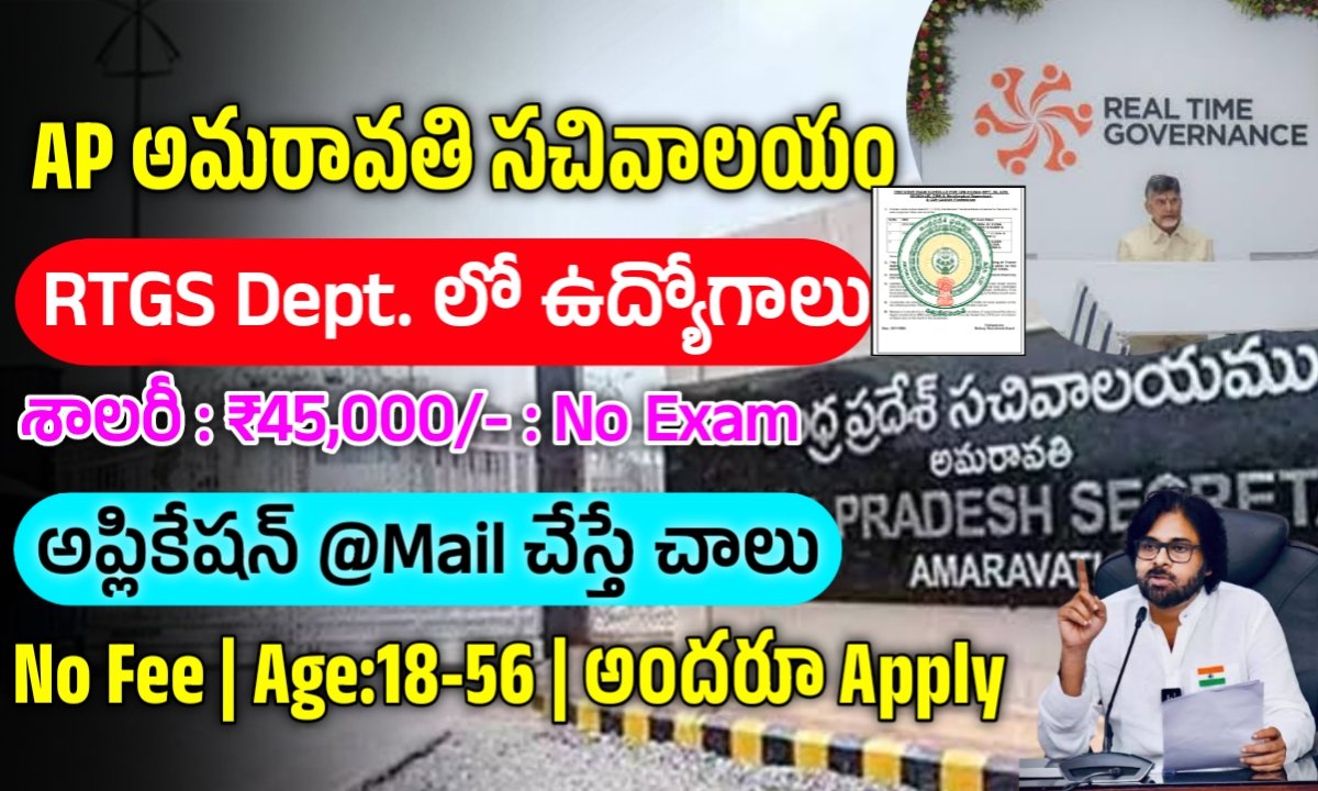 ఏపీ సెక్రటేరియట్ లోని RTGS డిపార్ట్మెంట్ లో 66 చీఫ్ డేటా & సెక్యూరిటీ ఆఫీసర్, చీఫ్ టెక్నాలజీ ఆఫీసర్, మేనేజర్, డేటా ఎనలిస్ట్, జనరల్ మేనేజర్, డేటా ఆర్చిటెక్ట్ వంటి చాలా రకాల ఉద్యోగాలను భర్తీ చేస్తున్నారు. ఈ ఉద్యోగాలకు డిగ్రీ, పీజీ వంటి అర్హతలు కలిగి పోస్టులను అనుసరించి 03 నుండి 10 సంవత్సరాల మధ్య వయస్సు కలిగినవారు దరఖాస్తు చేసుకోవచ్చు.