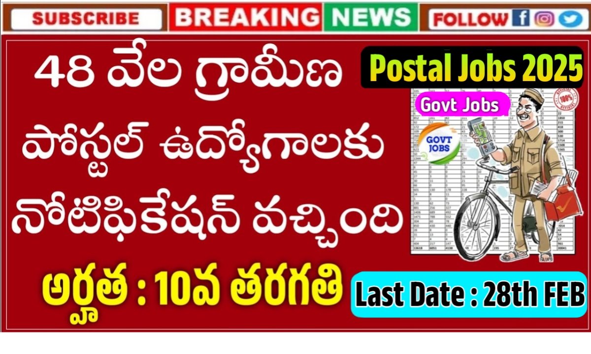 ప్రతి సంవత్సరం తపాలా శాఖ నుండి విడుదలయ్యే గ్రామీణ డాక్ సేవక్ ఉద్యోగాల నోటిఫికేషన్ మళ్ళీ ఇప్పుడు విడుదల కావడం జరిగింది. 48 వేల పోస్టులతో పోస్టల్ శాఖవారు అన్ని రాష్ట్రాల అభ్యర్థులు దరఖాస్తు చేసుకునే విధంగా విడుదల చేయడం జరిగింది. 10th అర్హత కలిగినవారు అప్లికేషన్ పెట్టుకోవాలి.