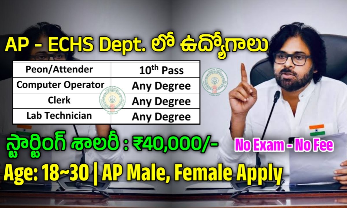 ఆంధ్రప్రదేశ్ ECHS డిపార్ట్మెంట్ నుండి విడుదలయిన కాంట్రాక్టు ఉద్యోగాలకు 31st జనవరి 2025 తేదీలోగా దరఖాస్తు చేసుకోగలరు. ఎటువంటి ఫీజు లేదు.