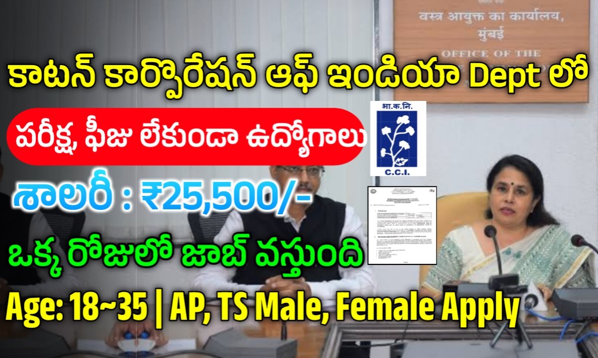 కేంద్ర ప్రభుత్వ సంస్థ ది కాటన్ కార్పొరేషన్ ఆఫ్ ఇండియా డిపార్ట్మెంట్ నుండి టెంపరరీ ల్యాబ్ అసిస్టెంట్ పోస్టులను భర్తీ చేయడానికి నోటిఫికేషన్ జారీ చేశారు. ఎటువంటి రాత పరీక్ష లేకుండా 8th ఫిబ్రవరి 2025 తేదీన అభ్యర్థులకు ఇంటర్వ్యూలు నిర్వహించడం ద్వారా సెలక్షన్ చేసి ఉద్యోగాలు ఇస్తారు. ఎలక్ట్రికల్, ఎలక్ట్రానిక్స్, ఇన్స్ట్రుమెంటేషన్ లో డిప్లొమా చేసి 18 నుండి 35 సంవత్సరాల మధ్య వయస్సు కలిగిన అభ్యర్థులు దరఖాస్తు చేసుకోగలరు. నోటిఫికేషన్ లోని పూర్తి సమాచారం చూసి వెంటనే దరఖాస్తు చేసుకోగలరు.