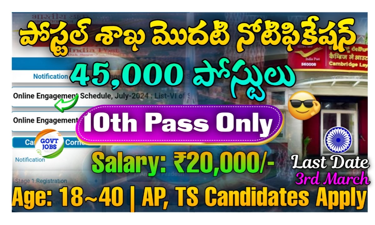 పోస్టల్ డిపార్ట్మెంట్ నుండి మొదటి నోటిఫికేషన్ కింద 45,000+ పోస్టులతో పోస్టల్ గ్రామీణ డాక్ సేవక్ (BPM, ABPM, DAK Sevak) ఉద్యోగాలను భర్తీ చేయడానికి నోటిఫికేషన్ జారీ చేశారు. 10వ తరగతి అర్హత కలిగినవారు అర్హులు.