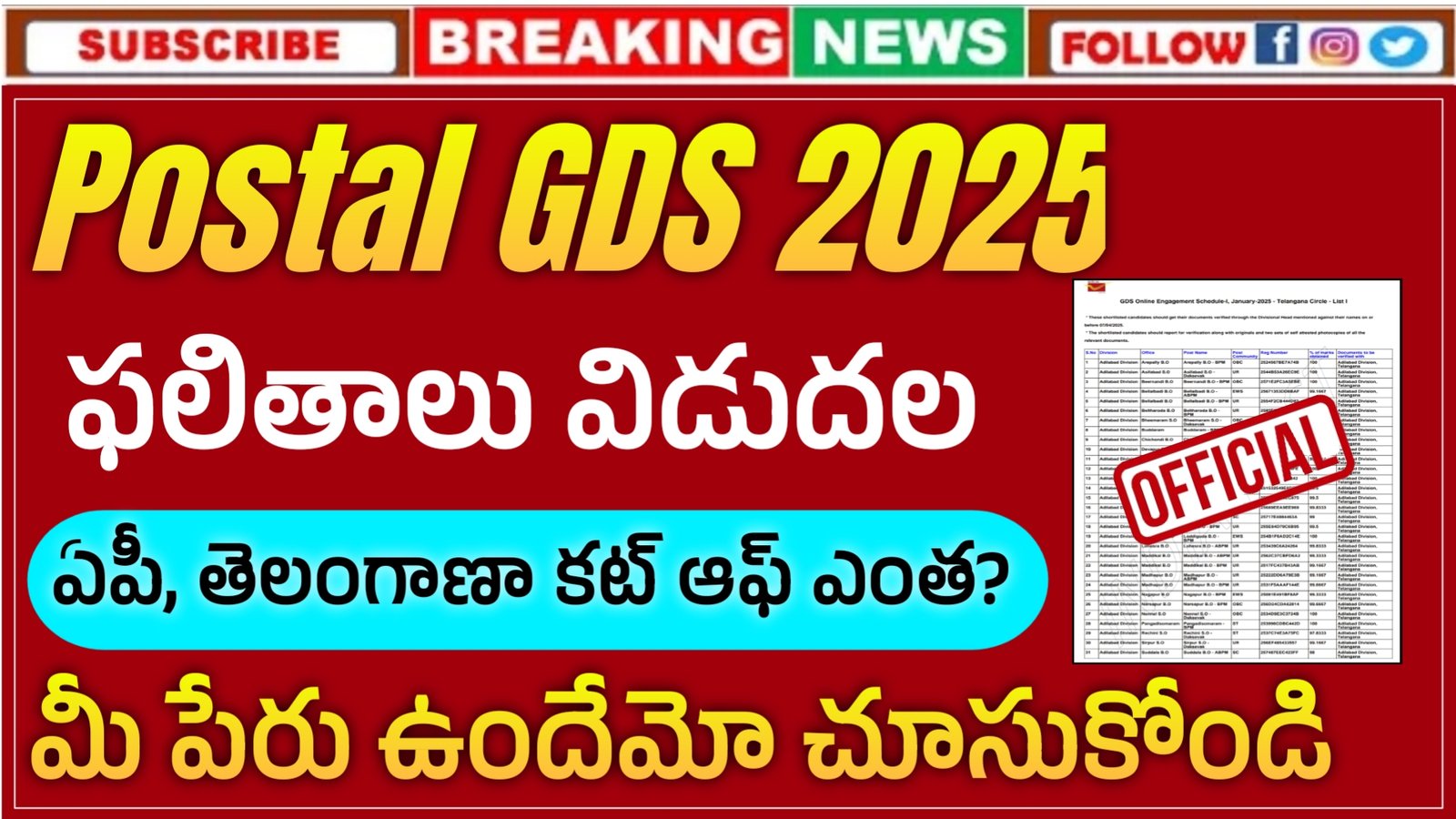 పోస్టల్ శాఖ నుండి అధికారికంగా 21,413 పోస్టులతో గ్రామీణ డాక్ సేవక్ నోటిఫికేషన్ విడుదల చేశారు. ఆంధ్రప్రదేశ్, తెలంగాణాతో పాటు ఇతర అన్ని రాష్ట్రాల అభ్యర్థులు దరఖాస్తు చేసుకోవచ్చు. 10th అర్హత కలిగినవారు దరఖాస్తు చేసుకోగలరు.