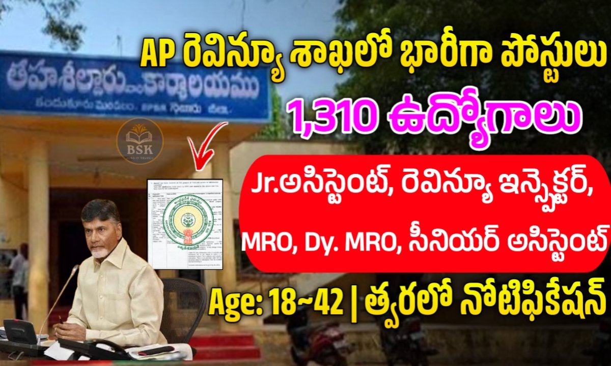 ఆంధ్రప్రదేశ్ లోని రెవెన్యూ డిపార్ట్మెంట్ నుండి 1310 జూనియర్ అసిస్టెంట్ తహసీల్దార్, డిప్యూటీ తహసీల్దార్, రెవిన్యూ ఇన్స్పెక్టర్, సీనియర్ అసిస్టెంట్ పోస్టుల ఖాళీగా ఉన్నట్లు సమాచారం. ఏదైనా డిగ్రీ అర్హత కలిగినవారు అర్హులు.