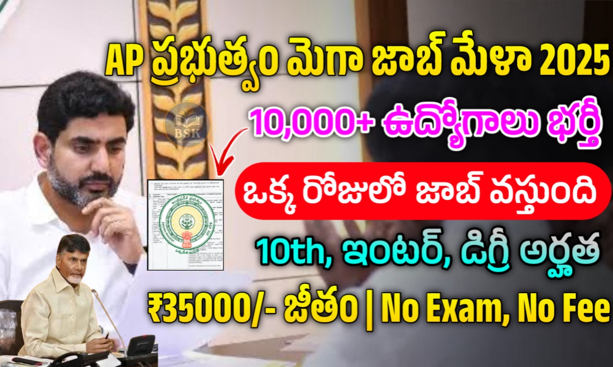 ఆంధ్రప్రదేశ్ ప్రభుత్వం మెగా జాబ్స్ ఫెయిర్ ని మార్చి 5,6 తేదీలలో నిర్వహించడం జరుగుతుంది. రాత పరీక్ష లేకుండా ఒక్కరోజులోనే ఇంటర్వ్యూలు నిర్వహించడం ద్వారా సెలక్షన్ చేసి ఉద్యోగాలు ఇస్తారు. డాక్యుమెంట్స్ వెరిఫికేషన్ చేసి ప్రైవేట్ సంస్థల్లో ఉద్యోగాలు ఇస్తారు.