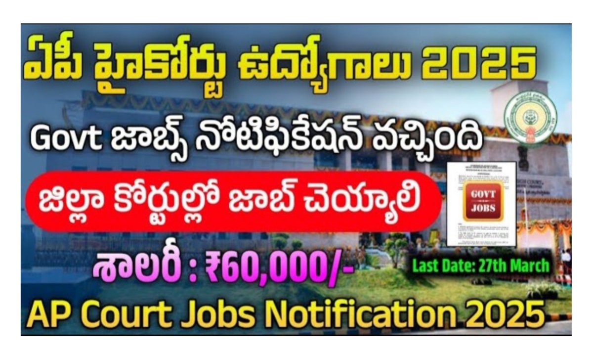 ఆంధ్రప్రదేశ్ హైకోర్టు నుండి విడుదలయిన గవర్నమెంట్ ఉద్యోగాలకు 27th మార్చిలోగా పూర్తి చేసిన దరఖాస్తు ఫారంని పోస్ట్ ద్వారా పంపించవలెను. ఆంధ్రప్రదేశ్ అమరావతిలోని హైకోర్టు అడ్రస్ కు పోస్ట్ ద్వారా అప్లికేషన్స్ పంపించవలెను.