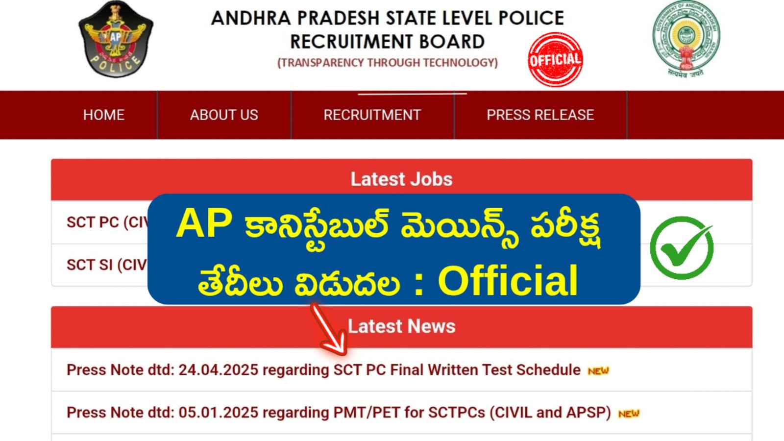 ఆంధ్రప్రదేశ్ పోలీస్ రిక్రూట్మెంట్ బోర్డ్ వారు అధికారికంగా కానిస్టేబుల్ మెయిన్స్ రాత పరీక్షలకు సంబంధించినటువంటి తేదీలను విడుదల చేయడం జరిగింది. (SCT Police Constable Civil & APSP) ఉద్యోగుల బత్తికి సంబంధించి మెయిన్స్ పరీక్ష తేదీలు విడుదల చేశారు. ఏపీ పోలీస్ కానిస్టేబుల్ ప్రిలిమ్స్ మరియు ఫిజికల్ ఈవెంట్స్ లో అర్హత పొందినటువంటి అభ్యర్థులు ఈ మెయిన్స్ రాత పరీక్షలకు హాజరు కావాల్సి ఉంటుంది.