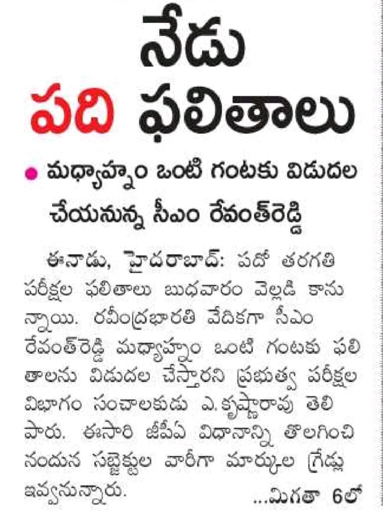తెలంగాణ టెన్త్ ఫలితాల కోసం ఉత్కంఠగా ఎదురు చూస్తున్నటువంటి విద్యార్థులకు శుభవార్త. ఈరోజు అనగా ఏప్రిల్ 30వ తేదీ మధ్యాహ్నం 2 గంటలకు తెలంగాణ ముఖ్యమంత్రి రేవంత్ రెడ్డి చేతుల మీదుగా రవీంద్ర భారతి వేదికగా ఫలితాలను విడుదల చేయనున్నట్లు ప్రభుత్వ పరీక్షలకు భాగం సంచాలకుడు ఏ.కృష్ణారావు తెలిపారు. మొత్తం 5.09 లక్షల మంది విద్యార్థులలో 4.9 లక్షల మంది పరీక్షలు రాశారు. ఈసారి గ్రేడింగ్ విధానంలో కాకుండా మార్కులు మరియు గ్రేడ్లతో పరీక్ష ఫలితాలు ఇవ్వనున్నారు. ఫలితాలకు సంబంధించిన పూర్తి సమాచారం తెలుసుకోండి.