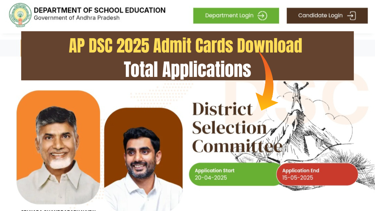 ఆంధ్రప్రదేశ్ మెగా డీఎస్సీకి దరఖాస్తు చేసుకున్న అభ్యర్థులు ఆన్లైన్లోనే వారు హాల్ టికెట్స్ డౌన్లోడ్ చేసుకోవడానికి సంబంధించి మే 30వ తేదీ నుండి అధికారిక వెబ్సైట్ apdsc.apcfss.in నందు హాల్ టికెట్స్ లేదా అడ్మిట్ కార్డ్స్ ని డౌన్లోడ్ చేసుకోవడానికి లింక్ ఆక్టివేట్ చేయడం జరుగుతుంది.
