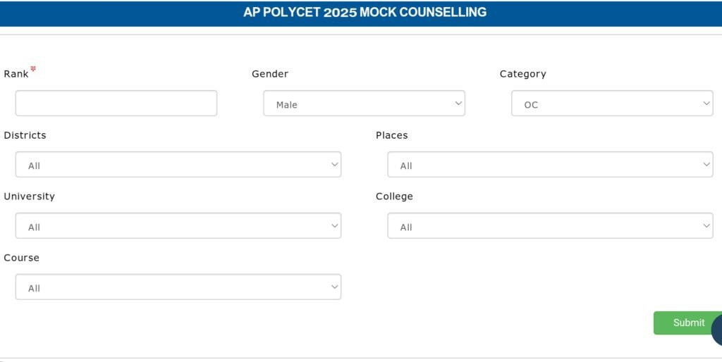 - మీకు వచ్చిన ర్యాంక్, జెండర్, కేటగిరి, జిల్లా, యూనివర్సిటీ, కాలేజ్, ఇతర వివరాలకు సంబంధించిన ఆప్షన్స్ అన్ని సెలెక్ట్ చేసి, సబ్మిట్ పే క్లిక్ చేయండి