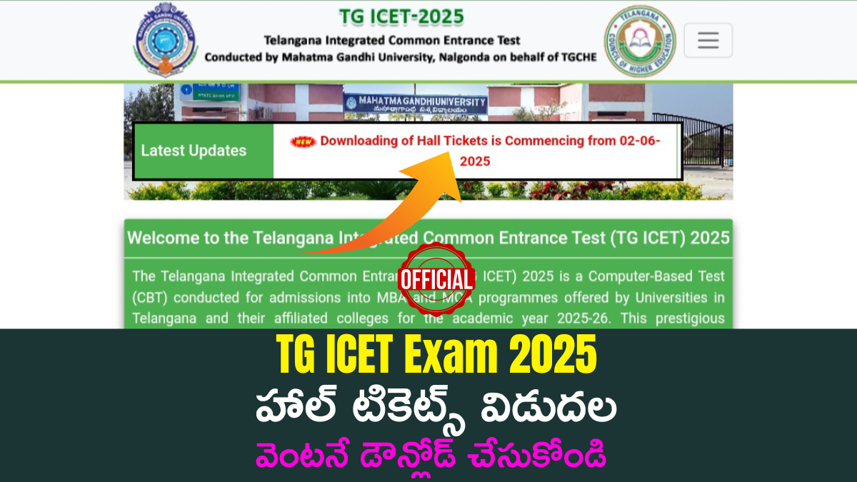 తెలంగాణలో పీజీ కోర్సులో ప్రవేశాల కోసం నిర్వహించే తెలంగాణ స్టేట్ ఇంటిగ్రేటెడ్ కామన్ ఎంట్రన్స్ టెస్ట్ (TG ICET) పరీక్ష హాల్ టికెట్లను జూన్ 2, 2025వ తేదీన విడుదల చేశారు. తెలంగాణలోని మహాత్మా గాంధీ యూనివర్సిటీ వారు ఈ పరీక్షలు నిర్వహిస్తున్నారు. ఈ పరీక్షలో ఉత్తీర్ణత సాధించినటువంటి వారు MBA, MCA కోర్సుల్లో ప్రవేశాలు పొందవచ్చు.