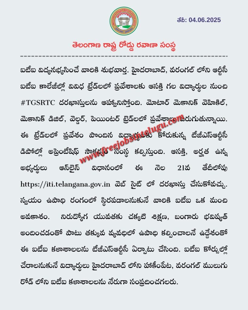తెలంగాణ రాష్ట్ర రోడ్డు రవాణా సంస్థ( TGSRTC) నుండి ITI విద్యార్థులకు ఒక మంచి శుభవార్త. తెలంగాణ ఆర్టీసీలో ఐటిఐ ట్రైనింగ్ ప్రవేశాల కోసం మోటార్ మెకానిక్ వెహికల్, డీజిల్, ఫిట్టర్, వెల్డర్, పెయింటర్ ట్రేడ్స్ లో చదువుతున్న విద్యార్థులకు ప్రత్యేకంగా ప్రాక్టికల్ ట్రైనింగ్ కల్పించేందుకు దరఖాస్తులు ఆహ్వానిస్తోంది. అర్హత కలిగిన అభ్యర్థులు జూన్ 21వ తేదీల్లోగా ఆన్లైన్లో దరఖాస్తు చేసుకోవాలి. పూర్తి వివరాలు ఈ ఆర్టికల్ ద్వారా చూద్దాం.