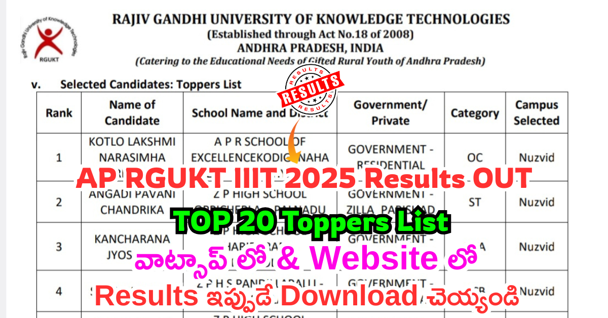 ఆంధ్రప్రదేశ్ ప్రభుత్వ ఆధ్వర్యంలో నడిచే ఆర్జీయూకేటీ ట్రిపుల్ ఐటీలలో ప్రవేశాలకు సంబంధించినటువంటి 2025 ఫలితాలను విడుదల చేశారు. మొత్తం 50,541 విద్యార్థులు 4000లకి పైగా ఉన్నటువంటి సీట్ల కోసం దరఖాస్తులు చేసుకున్నారు. ఆర్కే వ్యాలీ, ఒంగోలు, నూజివీడు, శ్రీకాకుళం త్రిబుల్ ఐటీలలో వీరికి సీట్లు కేటాయించడం జరిగింది. అలాగే ఈరోజు జిల్లాల వారీగా టాపర్స్ లిస్ట్ కూడా విడుదల చేశారు. జిల్లాల వారీగా ఎంపికైనటువంటి విద్యార్థులకు సంబంధించినటువంటి ఖాళీల సంఖ్యను కూడా మెన్షన్ చేయడం జరిగింది. ఆర్జీవికేటి త్రిబుల్ ఐటీ ప్రవేశాలకు దరఖాస్తులు చేసుకున్న విద్యార్థులు ఈ ఆర్టికల్ లోని పూర్తి సమాచారం చూసి వెంటనే మీ యొక్క రిజల్ట్స్ ని వెబ్సైట్ ద్వారా అలాగే వాట్సాప్ ద్వారా కూడా తెలుసుకోండి.