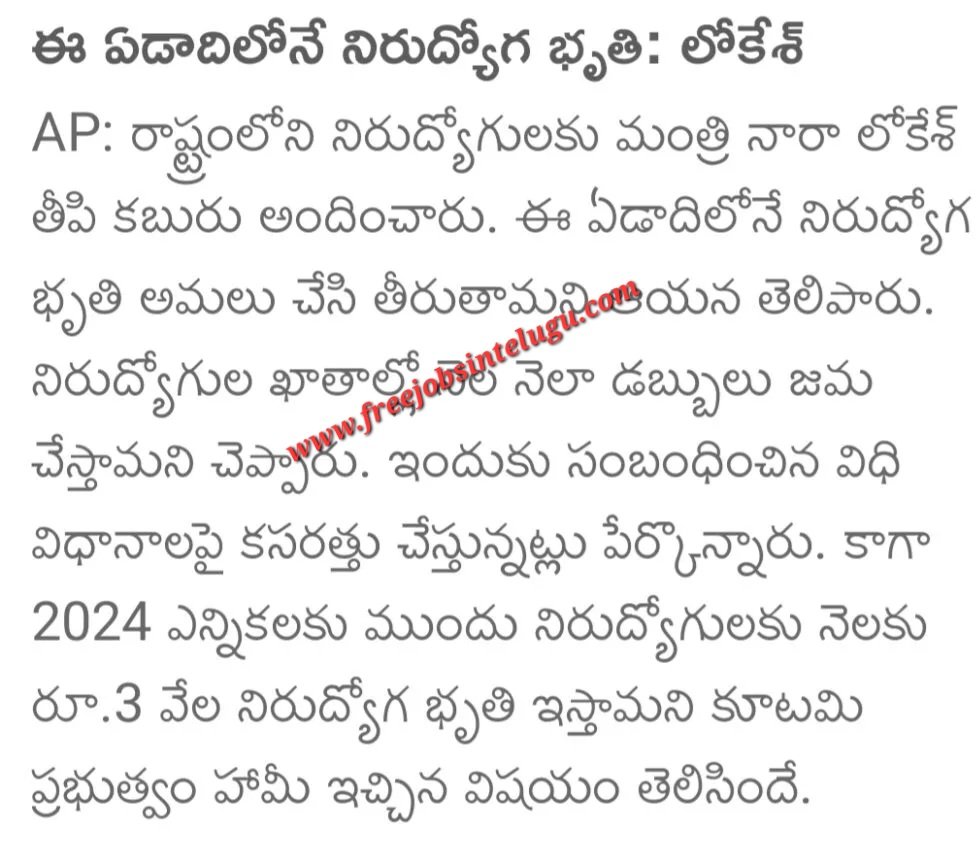 ఎన్నికలలో ఇచ్చిన హామీ మేరకు నిరుద్యోగుల ఎకౌంట్లో నెల నెల 3000/- వారి అకౌంట్లో జమ చేసి నిరుద్యోగ భృతి (AP Nirudhyoga Bruthi Scheme 2025) పథకాన్ని అమలు చేస్తామని మంత్రి నారా లోకేష్ స్పష్టం చేశారు. ఈ ఏడాదిలోనే నిరుద్యోగ భృతి పథకాన్ని ప్రారంభించాలని తుది నిర్ణయం తీసుకున్నట్లుగా మంత్రి నారా లోకేష్ తెలపడం జరిగింది. ఈ పథకాన్ని అమలు చేయడానికి సంబంధించి ఇతర శాఖలతో చర్చలు జరుపుతున్నట్లు ఆయన తెలిపారు. ఎన్నికల్లో వారు ఇచ్చిన నిరుద్యోగ భృతి హామీని గుర్తు చేస్తూ, కచ్చితంగా ఆ హామీని అమలు చేసి తీరుతామని, అది కూడా ఈ ఏడాదిలోనే ఈ పథకం ప్రారంభించడం జరుగుతుందని తెలిపారు.