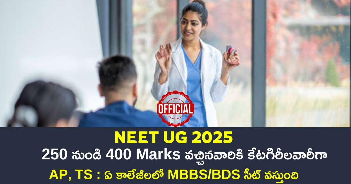 NEET UG 2025 ఫలితాలను ఇటీవల విడుదల చేసిన విషయం తెలిసిందే. ఫలితాలు వచ్చిన తర్వాత చాలామందికి 250 నుండి 400 మంది మార్కులు వచ్చిన వారు కూడా ఉన్నారు. అయితే ఈ మార్కులు వచ్చిన వారికి MBBS లేదా BDS సీటు అయినా వస్తుందా లేదా అనేటువంటి సందేహంలో ఉన్నారు. ఈ రేంజ్ మార్కులతో ఎలాంటి ప్రభుత్వ లేదా ప్రైవేటు కళాశాలల్లో అవకాశం ఉంటుంది. ఈ వివరాలు కేటగిరీల వారీగా, రాష్ట్రాల వారీగా, all India quota వివరాలను గత సంవత్సరంలో వచ్చిన మార్కులకు ఏ కాలేజీలలో సీటు వచ్చిందో ఆ డేటా ప్రకారం ఈ వివరాలు అందిస్తున్నాము. కాబట్టి ఈ ఆర్టికల్ లోని పూర్తి సమాచారం చూడండి.