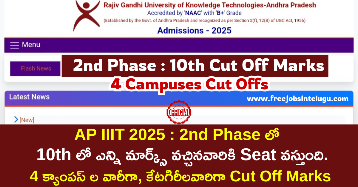 ఆంధ్రప్రదేశ్ ఆర్జీయూకేటీ త్రిబుల్ ఐటీ 2025 ప్రవేశాల కోసం నిర్వహిస్తున్న మొదటి దశ కౌన్సెలింగ్ ప్రక్రియ పూర్తయింది. రెండో దశ కౌన్సిలింగ్ ప్రక్రియ మరొక వారం రోజుల్లో ప్రారంభించనున్నారు. అయితే రెండవ దశ కౌన్సిలింగ్ ప్రక్రియకు 10వ తరగతిలో ఎన్ని మార్కులు వచ్చిన వారికి, ఏ క్యాంపస్ లో సీటు వస్తుందో తెలుసుకోవాలని ఒక ఆత్రుత ఉంటుంది. ఈ ఆర్టికల్ ద్వారా ఆంధ్రప్రదేశ్ లోని నాలుగు క్యాంపస్ లో అయినటువంటి నూజివీడు ఆర్కే వ్యాలీ, శ్రీకాకుళం, ఒంగోలు IIIT లలో క్యాటగిరిల వారిగా 10TH లో ఎన్ని మార్కులు వచ్చిన వారికి సెకండ్ ఫేజ్ లో సీటు వస్తుందో తెలుసుకుందాం. పూర్తి వివరాలు చూడండి.