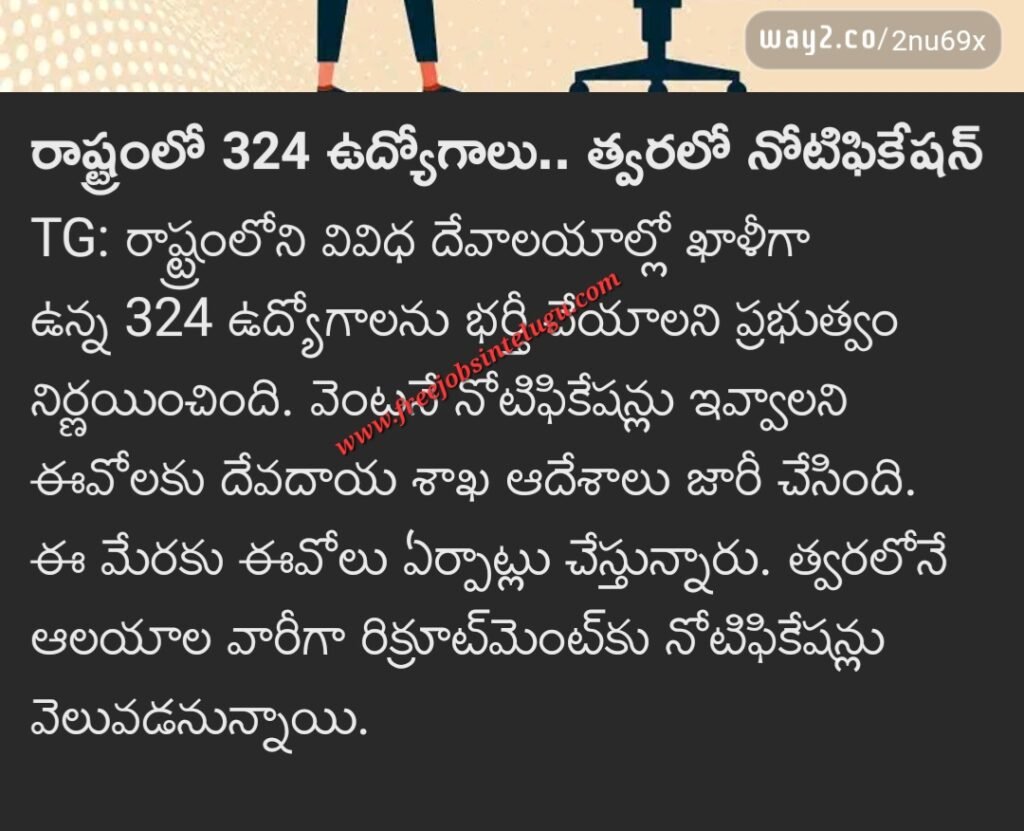 Note: తెలంగాణ దేవాదాయ శాఖలో ఖాళీగా ఉన్న 324 పోస్టుల భర్తీకి ప్రభుత్వం అనుమతి ఇచ్చింది. ఇంకా అధికారిక నోటిఫికేషన్ విడుదల కాలేదు. మరి కొద్ది రోజుల్లో నోటిఫికేషన్ విడుదల అయ్యే అవకాశం ఉన్నాయి కావున ప్రతిరోజు మా అధికారిక వెబ్సైట్ని సందర్శించండి.