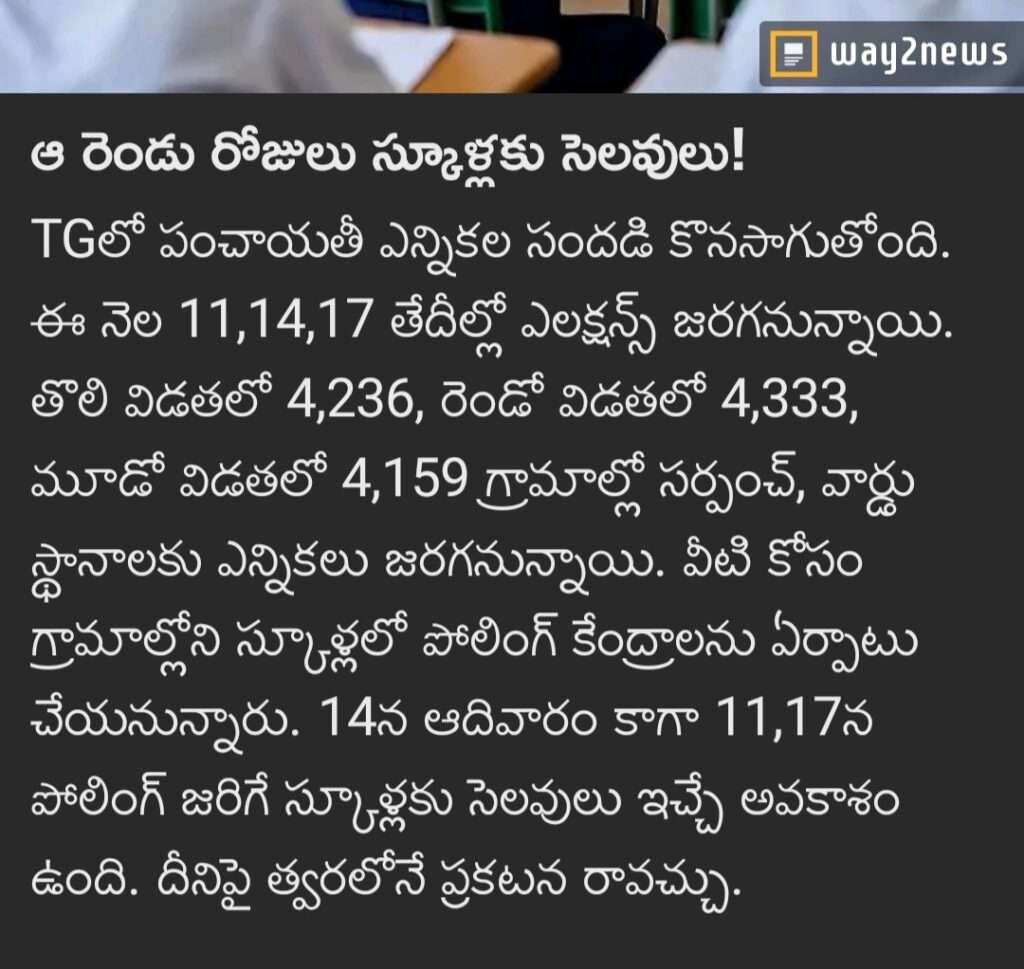 తెలంగాణలో స్థానిక ఎన్నికల నేపథ్యంలో తెలంగాణ ప్రభుత్వం స్కూల్ లకు హాలిడేస్ ఇచ్చే విషయంలో కీలక నిర్ణయం తీసుకుంది. పోలింగ్ మరియు ఎన్నికల నిర్వహణ కోసం ప్రభుత్వ పాఠశాలను వినియోగించనున్న నేపథ్యంలో రాష్ట్రంలోని పాఠశాలలకు డిసెంబర్ 11, 14, 17 తేదీలలో సెలవులు ప్రకటించనున్నారు. ఈ మేరకు తెలంగాణ ప్రభుత్వం నుండి అధికారిక సమాచారం వెలువడింది. మూడు రోజుల స్కూల్ హాలిడేస్ కి సంబంధించి వచ్చినటువంటి పూర్తి సమాచారం ఇప్పుడు తెలుసుకుందాం.