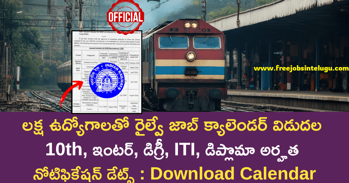 రైల్వేలో మరో లక్షకు పైగా ఉద్యోగాల భర్తీకి సన్నాహాలు చేస్తూ రైల్వే డిపార్ట్మెంట్ అధికారికంగా 2026- 27 రైల్వే జాబ్ క్యాలెండర్ ని ఇప్పుడే విడుదల చేయడం జరిగింది. ఈ జాబ్ కేలండర్ ద్వారా రైల్వే అసిస్టెంట్ లోకో పైలట్, సెక్షన్ కంట్రోలర్ ,జూనియర్ ఇంజనీర్, పారామెడికల్ క్యాటగిరీస్, రైల్వే నాన్ టెక్నికల్ పాపులర్ కేటగిరి (NTPC), మినిస్టీరియల్ మరియు ఐసోలేటెడ్ కేటగిరి, గ్రూప్ డి లెవెల్ వన్ నోటిఫికేషన్లను 2026 27 సంవత్సరంలో విడుదల చేయనున్నట్లు రైల్వే డిపార్ట్మెంట్ అధికారికంగా రైల్వే జాబ్ క్యాలెండర్ లో తెలిపింది. పదో తరగతి, ఇంటర్మీడియట్, ఐటిఐ, డిప్లమా, ఏదైనా డిగ్రీ, పోస్ట్ గ్రాడ్యుయేషన్ అర్హతలు కలిగిన ప్రతి ఒక్కరు ఈ ఉద్యోగాలకు దరఖాస్తు చేసుకోవడానికి అర్హులు. రైల్వే విడుదల చేసిన జాబ్ క్యాలెండర్ యొక్క పూర్తి సమాచారం ఈ ఆర్టికల్ ద్వారా చూసి తెలుసుకుందాం.