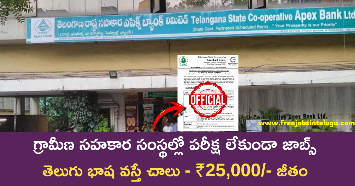 తెలంగాణ రాష్ట్ర కో-ఆపరేటివ్ అపెక్స్ బ్యాంక్ లిమిటెడ్ నుండి 07 ఇంటర్నె ఉద్యోగాలను భర్తీ చేయడానికి నిరుద్యోగ అభ్యర్థుల నుండి దరఖాస్తులు ఆహ్వానిస్తూ అధికారికంగా నోటిఫికేషన్ విడుదల చేశారు. ఎంబీఏ లేదా రెండు సంవత్సరాల పోస్ట్ గ్రాడ్యుయేషన్ పోస్ట్ చేసి 21 నుంచి 30 సంవత్సరాల మధ్య వయసు కలిగిన వారు ఈ ఉద్యోగాలకు దరఖాస్తు చేసుకోవచ్చు. ఎటువంటి రాత పరీక్ష లేకుండా అర్హతల్లో ఉన్న మెరిట్ మార్కులు ఆధారంగా అభ్యర్థులను ఎంపిక చేసి ఉద్యోగాలు ఇస్తారు. నోటిఫికేషన్ లోని ముఖ్యమైన వివరాలు చూసి అన్ని అర్హతలు ఉన్నవారు వెంటనే దరఖాస్తు చేసుకోండి.