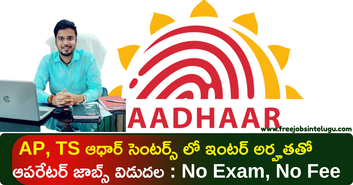 ఆధార్ సెంటర్లలో కాంట్రాక్ట్ విధానంలో పని చేయడానికి ఆంధ్రప్రదేశ్ మరియు తెలంగాణ నుండి సూపర్వైజర్ మరియు ఆపరేటర్ ఉద్యోగాల భక్తి కోసం నోటిఫికేషన్ విడుదల చేశారు. 18 సంవత్సరాలకు పైగా వయసు ఉన్న అభ్యర్థులందరూ ఆధార్ సెంటర్ లోని ఉద్యోగాలకు అప్లై చేసుకోవడానికి అర్హులు. ఇంటర్మీడియట్ , ఐటిఐ, డిప్లమా అర్హత కలిగి ఉన్నవారికి ఎటువంటి రాత పరీక్ష ఫీజు లేకుండా ఎంపిక చేసి పోస్టింగ్ ఇస్తారు. మీ మొబైల్ లోనే ఆన్లైన్లో ఉచితంగా దరఖాస్తులు చేసుకోవచ్చు. నోటిఫికేషన్ లోని పూర్తి వివరాలు చూసి వెంటనే అప్లై చేసుకోండి.