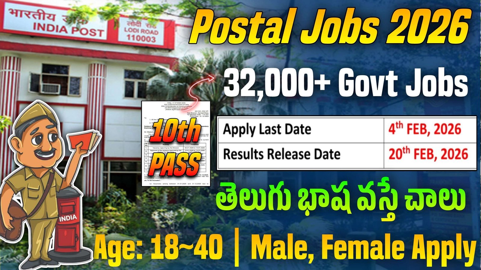 పోస్టల్ గ్రామీణ డాక్ సేవక్ ఉద్యోగాల భర్తీ కోసం జనవరి 20, 2026వ తేదీ నుండి ఫిబ్రవరి 4, 2026వ తేదీ వరకు ఆన్లైన్లో అప్లికేషన్ అంగీకరించనున్నారు. ఈ ఉద్యోగాలకు ఎటువంటి రాత పరీక్ష లేకుండా పదవ తరగతి అర్హత కలిగి 18 నుండి 40 సంవత్సరాల మధ్య వయస్సు కలిగిన అభ్యర్థులు ఆన్లైన్లో దరఖాస్తు చేసుకోవాలి. ఎంపికైన అభ్యర్థులకు నెలకు 18,500 వరకు జీతాలు చెల్లిస్తారు. ఇతర అన్ని రకాల కేంద్ర ప్రభుత్వ అలవెన్సెస్ కూడా ఉంటాయి. నోటిఫికేషన్ లోనే పూర్తి వివరాలు చూసి అప్లికేషన్ ప్రారంభమైన వెంటనే దరఖాస్తులు చేసుకోండి.