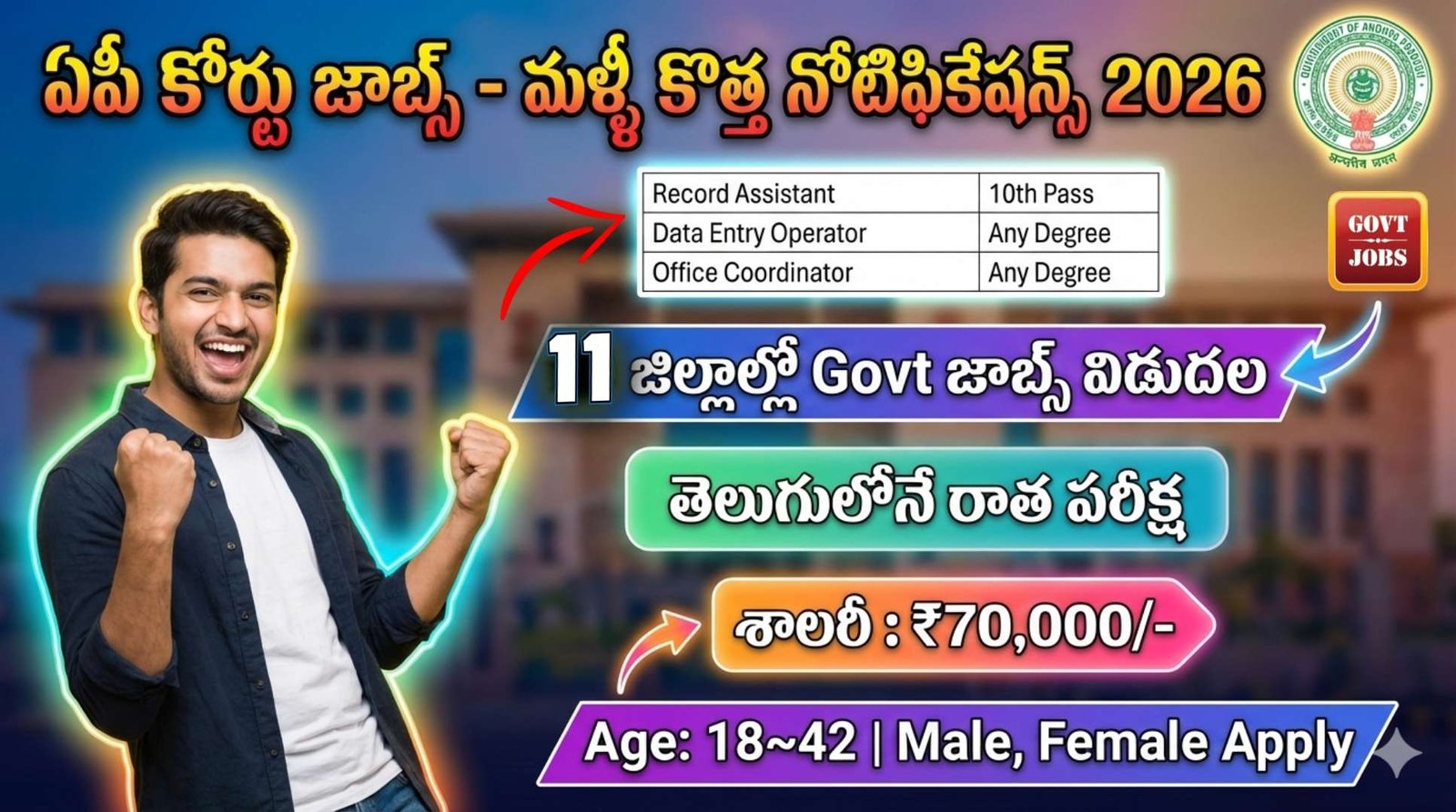 ఆంధ్రప్రదేశ్ జిల్లా కోర్టులో ఖాళీగా ఉన్న 35 ఉద్యోగాలను భర్తీ చేయడానికి మొత్తం 11 జిల్లా కోర్టుల నుండి డైరెక్ట్ రిక్రూట్మెంట్ కింద అధికారికంగా ప్రకటన జారీ చేశారు. రికార్డ్ అసిస్టెంట్ , డేటా ఎంట్రీ ఆపరేటర్, ఫ్రంట్ ఆఫీస్ కోఆర్డినేటర్ పోస్టులను భర్తీ చేయనున్నారు. శ్రీకాకుళం, విజయనగరం, విశాఖపట్నం, తూర్పుగోదావరి, పశ్చిమగోదావరి, కృష్ణ, అనంతపురం, చిత్తూరు కడప కర్నూలు జిల్లాల నుండి నోటిఫికేషన్స్ విడుదల చేశారు. రాతపరీక్ష, స్కిల్ టెస్ట్, ఇంటర్వ్యూ ఆధారంగా అభ్యర్థులను ఎంపిక చేస్తారు. 18 నుండి 42 సంవత్సరాల మధ్య వయసు కలిగి ఉండాలి. పదవ తరగతి, ఏదైనా డిగ్రీ అర్హత కలిగిన వారికి ప్రాధాన్యత ఉంటుంది. నోటిఫికేషన్ లోని పూర్తి వివరాలు ఈ ఆర్టికల్ ద్వారా చూడండీ.