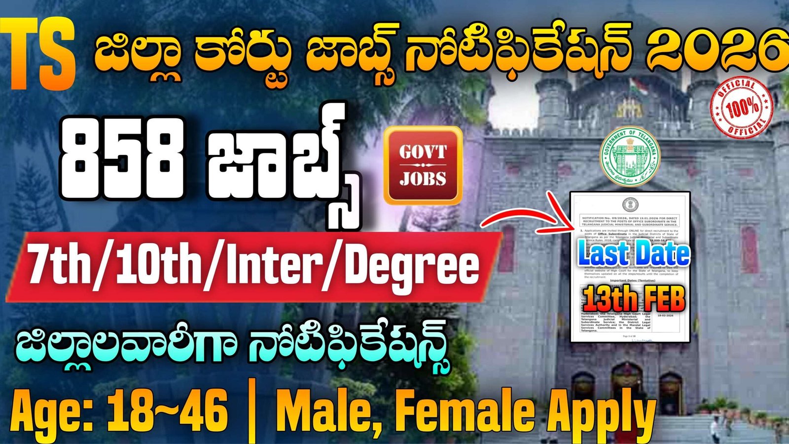 తెలంగాణలోని జిల్లా కోర్టులో పనిచేయడానికి 858 పోస్టులతో కోర్టు ఉద్యోగాల నోటిఫికేషన్ విడుదల చేశారు. జూనియర్ అసిస్టెంట్, ఆఫీసు సబార్డినేట్, రికార్డు అసిస్టెంట్, ఎగ్జామినర్, ఫీల్డ్ అసిస్టెంట్, స్టెనోగ్రాఫర్, టైపిస్ట్, కాపిస్ట్, ప్రాసెస్ సర్వర్ ఉద్యోగాలు ఉన్నాయి . ఈ ఉద్యోగాలకు ఏడవ తరగతి, పదవ తరగతి, ఇంటర్మీడియట్, డిగ్రీ అర్హత కలిగిన ప్రతి ఒక్కరూ అప్లై చేసుకోవచ్చు. 18 నుండి 46 సంవత్సరాల మధ్య వయసు కలిగి ఉండాలి. ఆఫ్లైన్ విధానంలో ప్రాంత పరీక్ష నిర్వహించి, ఇంటర్వ్యూ ద్వారా అభ్యర్థులను షార్ట్ లిస్టు చేసి ఉద్యోగాలు ఇస్తారు. నోటిఫికేషన్ లోని ముఖ్యమైన వివరాలు ఈ ఆర్టికల్ ద్వారా చూడండి.