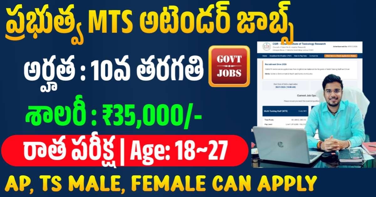 కేంద్ర ప్రభుత్వ సంస్థ CSIR ఇండియన్ ఇన్స్టిట్యూట్ ఆఫ్ టాక్సికాలజీ రీసెర్చ్ డిపార్ట్మెంట్ నుండి ఆరు పోస్టులతో మల్టీ టాస్కింగ్ స్టాఫ్, డ్రైవర్ ఉద్యోగాలకు దరఖాస్తు చేసుకోవడానికి నోటిఫికేషన్ విడుదల చేశారు. పదవ తరగతి అర్హత కలిగి 18 నుండి 27 సంవత్సరాల మధ్య వయసు కలిగిన వారు ఈ ఉద్యోగాలకు అప్లై చేసుకోవచ్చు. డ్రైవర్ ఉద్యోగాలకు లైట్ మోటార్ వెహికల్ లైసెన్స్ కూడా కలిగి ఉండాలి. రాత పరీక్ష మరియు సర్టిఫికెట్ల పరిశీలన ద్వారా అభ్యర్థులను ఎంపిక చేస్తారు. నోటిఫికేషన్ లోని పూర్తి సమాచారం చూసి వెంటనే అప్లికేషన్స్ పెట్టుకోండి.