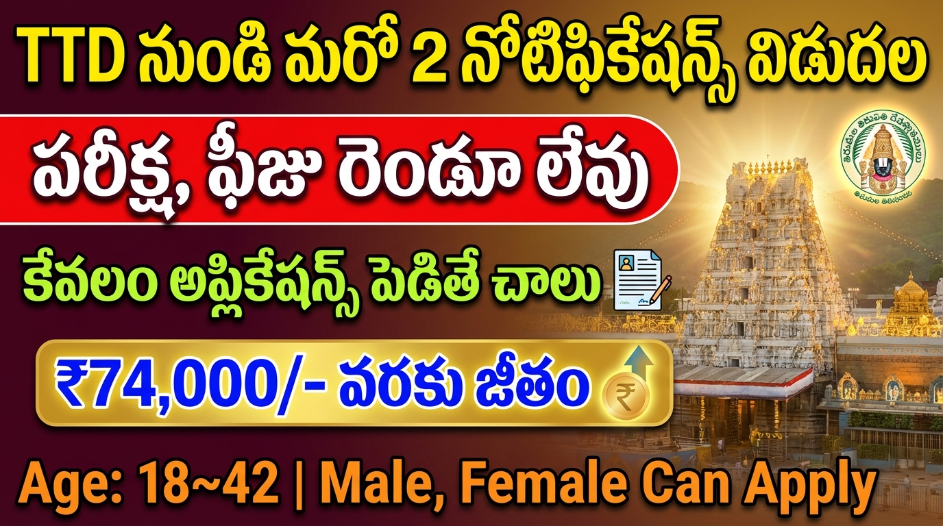 తిరుమల తిరుపతి దేవస్థానం నుండి అధికారికంగా అహితాగ్ని మరియు ప్రొఫెసర్ ఉద్యోగాలను భర్తీ చేయడం కోసం నోటిఫికేషన్లను విడుదల చేశారు. ఈ పోస్టులకు ఎటువంటి రాత పరీక్ష మరియు ఫీజు లేకుండా అర్హత కలిగినటువంటి అభ్యర్థులను ఎంపిక చేసే విధంగా అర్హులైన అభ్యర్థుల నుండి దరఖాస్తులు ఆహ్వానిస్తున్నారు. ఈ ఉద్యోగాలకు ఇంటర్వ్యూలు నిర్వహించి పోస్టింగ్ ఇస్తారు. 18 నుండి 42 సంవత్సరాల మధ్య వయసు కలిగిన వారు ఈ పోస్టులకు దరఖాస్తులు చేసుకోవాలి. నోటిఫికేషన్ లోని పూర్తి సమాచారం ఈ ఆర్టికల్ ద్వారా చూసి తెలుసుకుందాం.