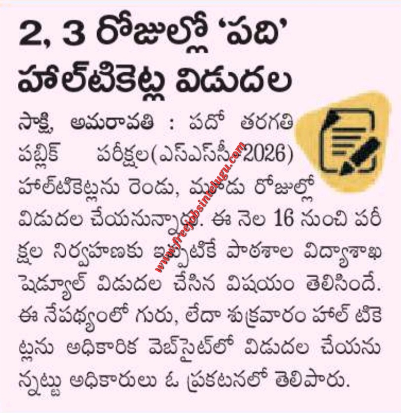 ఆంధ్రప్రదేశ్ పదో తరగతి 2026 హాల్ టికెట్లను గురువారం లేదా శుక్రవారం రోజున విడుదల చేయనున్నట్లు ఎస్ఎస్సి బోర్డు అధికారులు సాక్షి మీడియాతో తెలిపారు.. అయితే ఈరోజు వెబ్సైట్లో లింక్ యాక్టివేట్ చేసినప్పటికీ కొన్ని సాంకేతిక సమస్యల కారణాలవల్ల, సైట్ ఓపెన్ కాలేదు. దీంతో విద్యార్థులు ఆందోళన చెందుతున్నారు. మరో రెండు, మూడు రోజుల్లో ఎటువంటి సాంకేతిక సమస్యలు తలెత్తకుండా హాల్టికెట్లను అధికారిక వెబ్సైట్లో అప్లోడ్ చేయనున్నట్లు ఎస్ఎస్సి బోర్డు అధికారులు తెలియజేశారు.