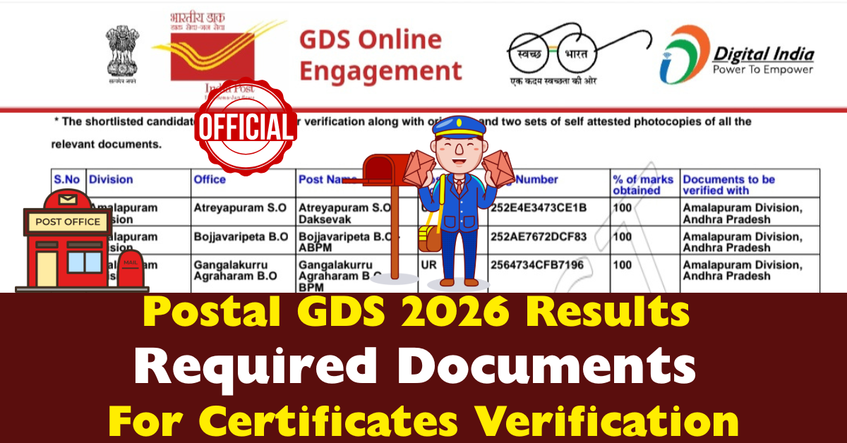 పోస్టల్ గ్రామీణ డాక్ సేవక్ 2026 28,700+ పోస్టుల యొక్క మొదటి మెరిట్ లిస్టు ఫలితాలను త్వరలో పోస్టల్ డిపార్ట్మెంట్ విడుదల చేయనుంది. మొదటి మెరిట్ లిస్టులో ఎంపికైన అభ్యర్థులకు డాక్యుమెంట్ వెరిఫికేషన్ నిర్వహిస్తారు. డాక్యుమెంట్ వెరిఫికేషన్ కి హాజరయ్యే అభ్యర్థులు కచ్చితంగా తమ వెంట తీసుకువెళ్లాల్సిన ఒరిజినల్ మరియు జిరాక్స్ సర్టిఫికెట్ కాపీలకి సంబంధించిన పూర్తి లిస్టుని ఈ ఆర్టికల్ ద్వారా చూసి వాటిని సిద్ధం చేసుకోండి. డాక్యుమెంట్ వెరిఫికేషన్ లో ఏ ఒక్క సర్టిఫికెట్ లేకపోయినా కూడా మీరు ఉద్యోగాన్ని కోల్పోయే అవకాశం ఉంటుంది కాబట్టి మీరు ముందుగానే ఆ సర్టిఫికెట్లను సమకూర్చుకోవాలి. ఈ ఆర్టికల్ ద్వారా పూర్తి సమాచారం చూసి మీ దగ్గర ఈ సర్టిఫికెట్స్ ఉన్నాయో లేదో చెక్ చేసుకోండి.