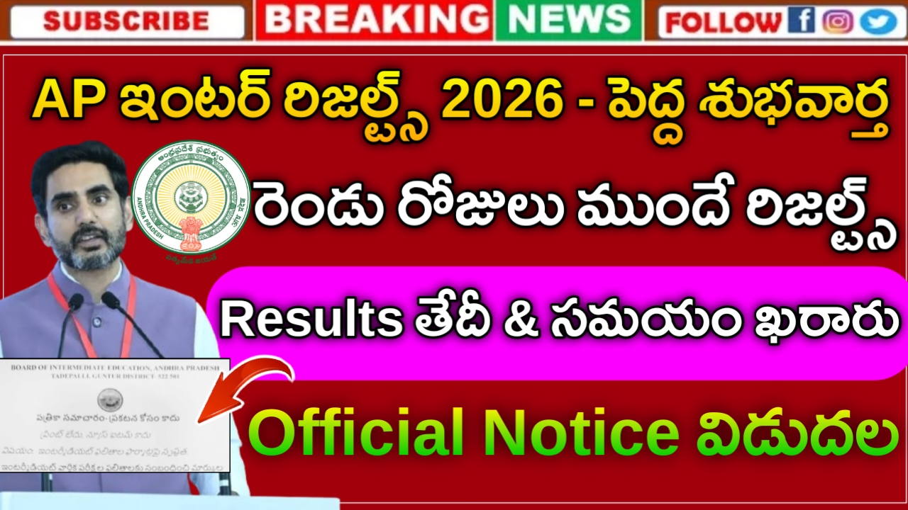 ఆంధ్రప్రదేశ్ ఇంటర్మీడియట్ 2026 మొదటి మరియు రెండవ సంవత్సర పరీక్షలు యొక్క ఫలితాల కోసం ఎదురుచూస్తున్నటువంటి విద్యార్థులకు పెద్ద శుభవార్త. ఫలితాలను రెండు రోజులు ముందుగానే విడుదల చేయడానికి సంబంధించి, ఆంధ్రప్రదేశ్ ఇంటర్మీడియట్ బోర్డు అధికారులు ఇంటర్మీడియట్ ఫలితాల ఫార్మేట్ ల పై స్పష్టతనిస్తూ అధికారికంగా ఒక ప్రకటన జారీ చేశారు. అఫీషియల్ గా విడుదల చేసిన ఈ ప్రకటన ఆధారంగా ఫలితాలను ఏప్రిల్ 15 లేదా 16వ తేదీల్లో విడుదల చేయడానికి అధికారులు సిద్ధమైనట్లుగా తెలుస్తోంది. ఏప్రిల్ 19వ తేదీన విడుదల చేయాల్సినటువంటి ఫలితాలను రెండు మూడు రోజులు ముందుగానే విడుదల చేయనున్నారు. ఏపీ ఇంటర్ ఫలితాలకు సంబంధించి కొత్తగా వచ్చిన తాజా సమాచారం గురించి ఇప్పుడు చూద్దాము.