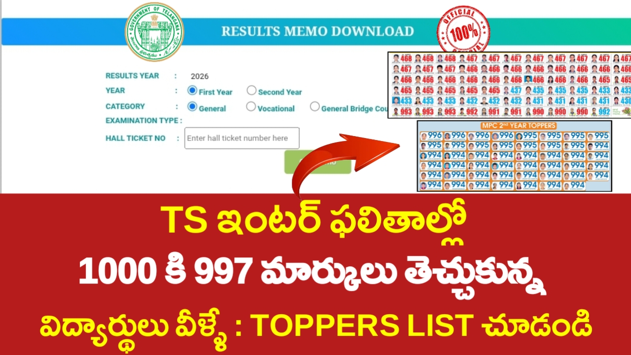నిన్న ఏప్రిల్ 12 2026వ తేదీన తెలంగాణ ఇంటర్మీడియట్ మొదటి మరియు రెండో సంవత్సర పరీక్షల యొక్క ఫలితాలను ఉదయం 11 గంటలకు అధికారికంగా ప్రభుత్వ సలహాదారు కే కేశవరావు గారి చేతుల మీదుగా విడుదల చేశారు. మొత్తం 9.97 లక్షల మంది విద్యార్థులు పరీక్షలు రాయిగా ఇందులో 9.5 లక్షల మంది విద్యార్థులు పాసయ్యారు. అయితే ఫలితాలు సాధించిన వారిలో మొదటి ఇంటర్మీడియట్ సంవత్సర విద్యార్థులలో MPC లో 470 మార్కులకు 469 మార్కులు తెచ్చుకున్న విద్యార్థులు చాలా మంది ఉన్నారు. అలాగే రెండు సంవత్సరాలు కలిపి MPC లో 1000 మార్కులకు 997 మార్కులతో సాయి శ్రేష్ఠిత అనే అమ్మాయి టాపర్ గా నిలిచింది. అలాగే BiPC లో కే. జ్యోత్స్న, హఫ్ఫాబేగం 1000 మార్కులకు 997 మార్కులతో టాపర్స్ గా నిలిచారు. నిన్న విడుదలైన ఇంటర్మీడియట్ మొదటి మరియు రెండో సంవత్సర పరీక్షల్లో అత్యున్నతమైన ఉత్తీర్ణత మహిళా స్టూడెంట్స్ మాత్రమే సాధించారు.