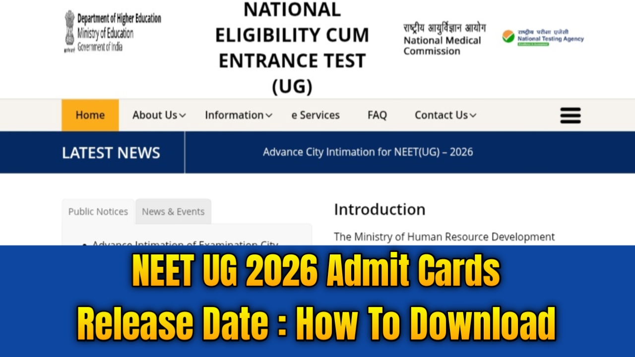 నేషనల్ టెస్టింగ్ ఏజెన్సీ త్వరలో తన అధికారిక వెబ్సైట్లో నీట్ యూజీ 2026 పరీక్షల యొక్క అడ్మిట్ కార్డులను విడుదల చేయనుంది. తాజా సమాచారం ప్రకారం పరీక్షకు కొన్ని రోజుల ముందు ఏప్రిల్ 2026 చివరి వారంలో అడ్మిట్ కార్డు విడుదల అయ్యే అవకాశం ఉంది. అయితే నీట్ యూజీ 2026 పరీక్షను మే 3, 2026వ తేదీన నిర్వహించనున్నారు. పరీక్షకు కరెక్టుగా పది రోజుల ముందు నుండి అడ్మిట్ కార్డులను డౌన్లోడ్ చేసుకోవడానికి నేషనల్ టెస్టింగ్ ఏజెన్సీ అవకాశం కల్పిస్తుంది.