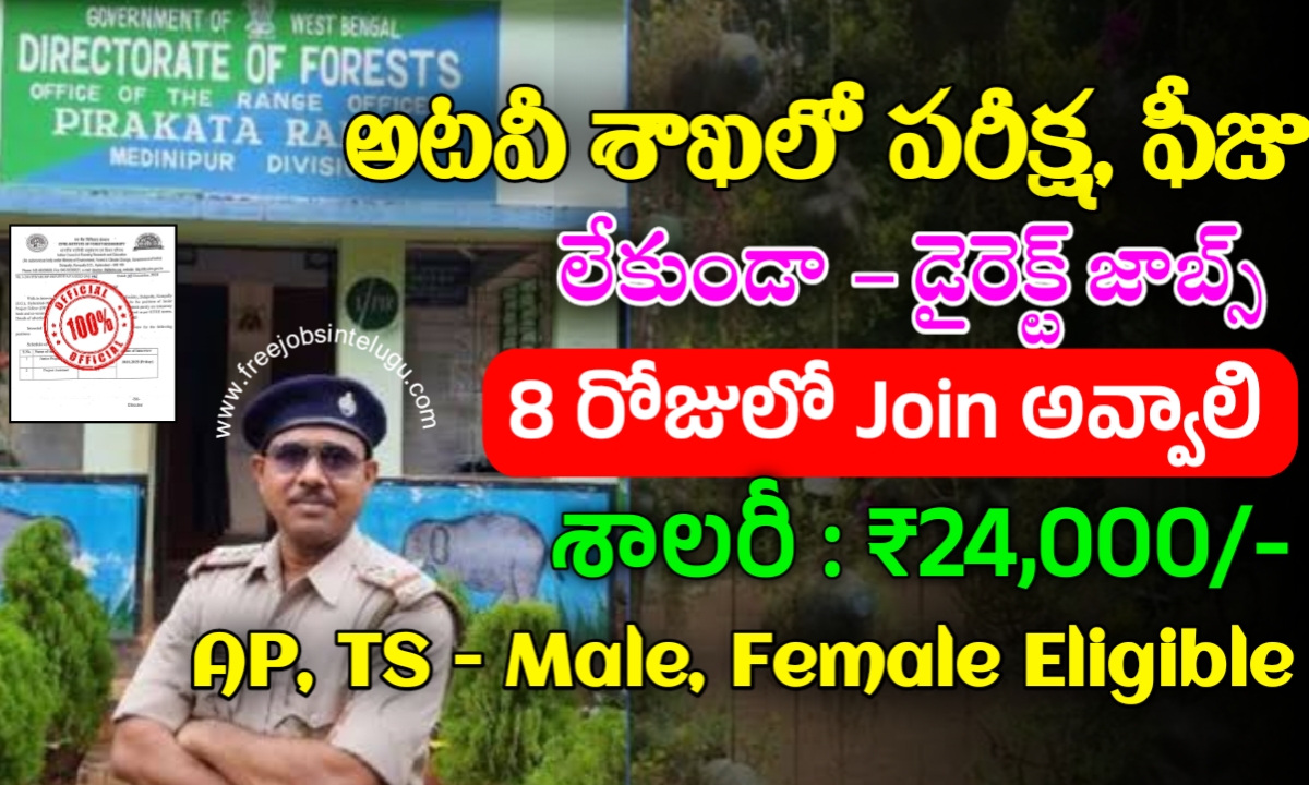 అటవీ శాఖ ఉద్యోగాలకు దరఖాస్తు చేసుకున్న అభ్యర్థులకు జనవరి 10th న రాత పరీక్ష లేకుండా వాక్ ఇన్ ఇంటర్వ్యూ ద్వారా ఎంపిక చేసి ఉద్యోగాలు ఇస్తారు. రాత పరీక్ష, ఫీజు ఏమీ లేదు. మెరిట్ మార్కులు ఉంటే చాలు.
