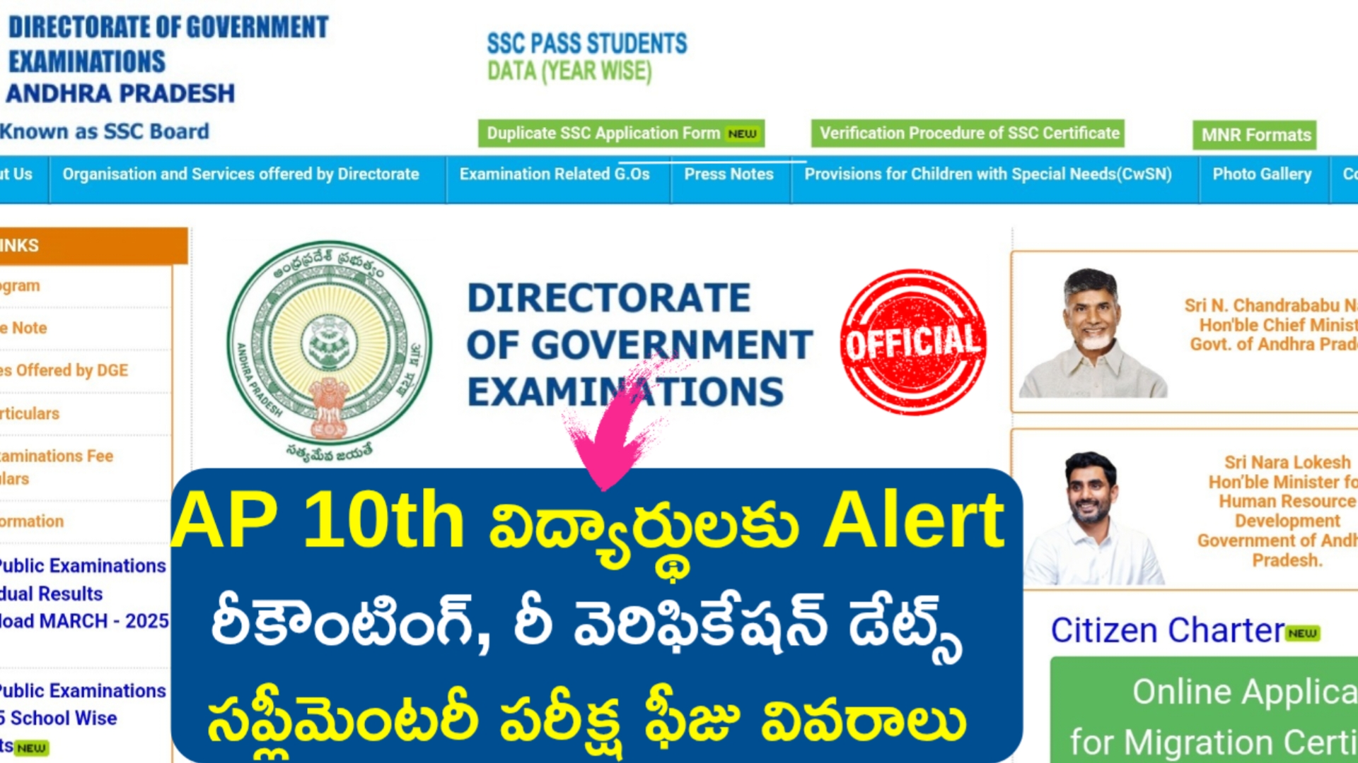 ఆంధ్రప్రదేశ్ బోర్డు ఆఫ్ సెకండరీ ఎడ్యుకేషన్ వారు ఈరోజు ఉదయం 10 గంటలకు ఆంధ్రప్రదేశ్ లోని పదవ తరగతి ఫలితాలను విడుదల చేశారు. ఈ పరీక్షల్లో ఫెయిల్ అయినటువంటి అభ్యర్థుల కోసం సప్లిమెంటరీ రాత పరీక్షల యొక్క షెడ్యూల్ ని విడుదల చేయడం జరిగింది. పదో తరగతి పరీక్ష ఫలితాలను చాలెంజ్ చేయాలి అనుకునేటువంటి విద్యార్థుల కోసం రీకౌంటింగ్, రీ వెరిఫికేషన్ తేదీలతో పాటు ఎంత ఫీజు చెల్లించాలనేటువంటి పూర్తి సమాచారాన్ని ఈ ఆర్టికల్ చదవడం ద్వారా తెలుసుకోవచ్చు.
