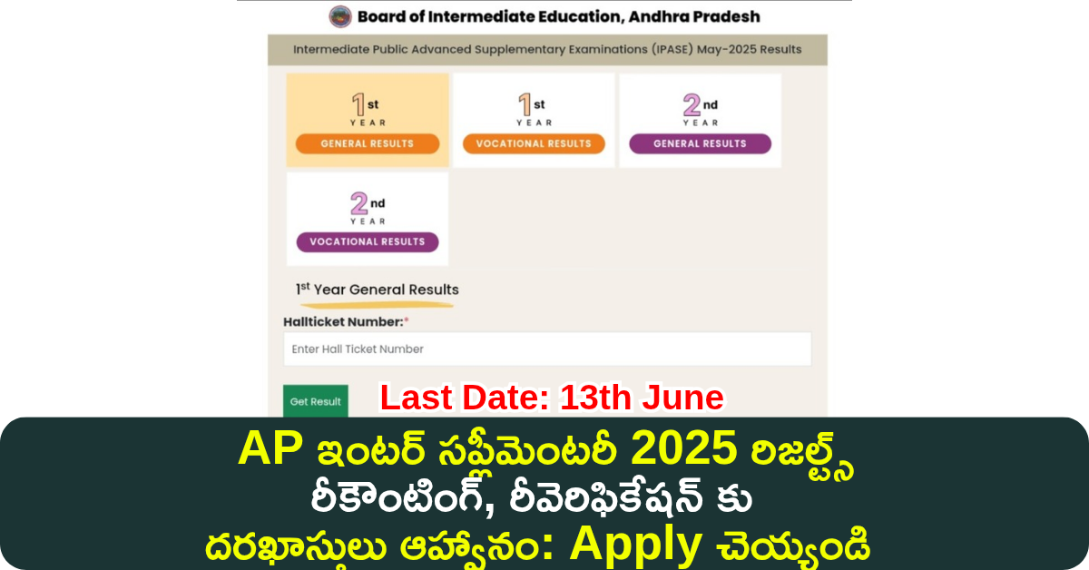 ఆంధ్రప్రదేశ్లో మే 12వ తేదీ నుండి 20వ తేదీ వరకు నిర్వహించిన ఇంటర్మీడియట్ అడ్వాన్స్డ్ సప్లిమెంటరీ పరీక్ష ఫలితాలను జూన్ 7వ తేదీ ఉదయం 11 గంటలకు ఆంధ్రప్రదేశ్ బోర్డ్ ఆఫ్ ఇంటర్మీడియట్ ఎడ్యుకేషన్ వారు విడుదల చేశారు. ఈ ఫలితాలు ఇంటర్ బోర్డు యొక్క అధికారిక వెబ్సైట్లో అందుబాటులో ఉన్నాయి. ఈ పరీక్షలను దాదాపు రెండు లక్షల మంది ఇంటర్ విద్యార్థులు రాశారు. ఇందులో మొదటి ఏడాది 46 శాతం మంది రెండవ, ఏడాది 63% మంది విద్యార్థులు ఉత్తీర్ణత సాధించారు. అయితే ఇందులో ఉత్తెనకు సాధించిన విద్యార్థులు రీకౌంటింగ్ మరియు రివెరిఫికేషన్కు దరఖాస్తు చేసుకోవడానికి జూన్ 13వ తేదీ వరకు సమయం ఇస్తూ ఏపీ ఇంటర్మీడియట్ బోర్డు వారు ఉత్తర్వులు జారీ చేశారు. ఈరోజు వచ్చిన తాజా సమాచారం గురించి ఇప్పుడు చూద్దాం.