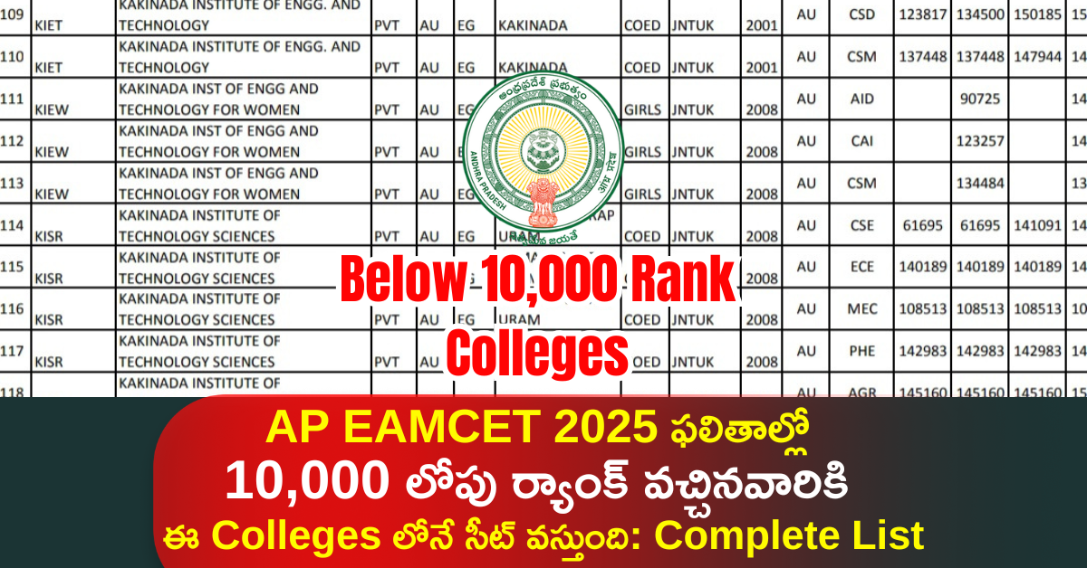 ఏపీ ఎంసెట్ 2025 ఫలితాలు జూన్ 8వ తేదీన విడుదల చేసిన విషయం తెలిసిందే. అయితే ఫలితాలలో 10 వేల లోపు ర్యాంకు తెచ్చుకున్నటువంటి వారికి ఏ కాలేజీలలో సీటు వస్తుందో తెలుసుకోవాలనే ఒక ఆత్రుత ఉంటుంది. మీ ర్యాంకు తగిన టాప్ ఇంజనీరింగ్ కాలేజీలు మరియు యూనివర్సిటీలకి సంబంధించినటువంటి పూర్తి జాబితా ఈ క్రింది విధంగా ఉంటుంది. ఇది గత సంవత్సరాల్లో ర్యాంకుల ఆధారంగా స్టూడెంట్స్ పొందినటువంటి కాలేజీల వివరాలను ఆధారంగా చేసుకొని ఈ డేటా ని ప్రిపేర్ చేయడం జరిగింది.