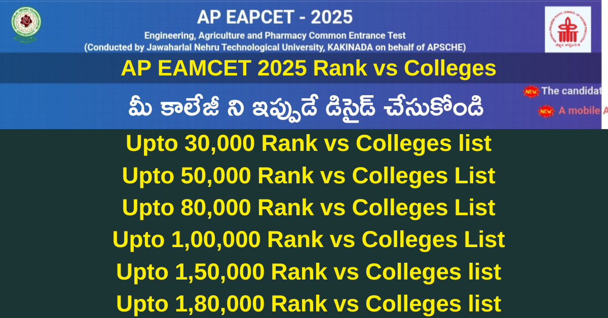 ఏపీ ఎంసెట్ 2025 ఫలితాలు విడుదల అయ్యి చాలా రోజులవుతుంది. ఇప్పుడు విద్యార్థులు తమ ర్యాంక్ ఆధారంగా ఏ కాలేజీలో సీటు వస్తుందో తెలుసుకోవాలనేటివంటి ఒక ఉచ్చుకతతో ఉన్నారు. ఈ నేపథ్యంలో 2024 కటాఫ్ లను ఆధారంగా చేసుకుని 30 వేల నుండి 1,50,000 వరకు ర్యాంకు వచ్చినటువంటి విద్యార్థులకు లభించే బెస్ట్ కాలేజీ ల వివరాలు ఈ క్రింది సమాచారం ద్వారా ఇవ్వడం జరిగింది. ఈ ఆర్టికల్ ద్వారా మీరు