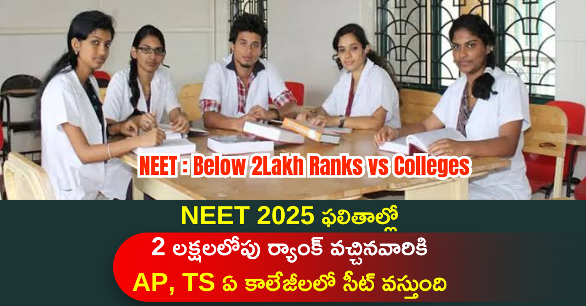 NEET 2025 ఫలితాలు విడుదలైన తర్వాత,చాలామంది విద్యార్థుల్లో ఉన్న ఆలోచన ఏమిటంటే, ఇప్పుడు నాకు వచ్చిన ర్యాంక్ ఆధారంగా ఏ కాలేజీలో సీటు వస్తుంది? అని ఆలోచిస్తూ ఉన్నారు. గత సంవత్సరాల్లో వచ్చిన ర్యాంకుల ఆధారంగా కాలేజీల్లో seats సాధించినటువంటి విద్యార్థుల యొక్క డేటా ఆధారంగా చేసుకొని రెండు లక్షల లోపు ర్యాంకు వచ్చిన విద్యార్థులకు ఏపీ, తెలంగాణలో ఏ కాలేజీలో సీటు వస్తుందో ఈ ఆర్టికల్ ద్వారా చూసి తెలుసుకుందాం.