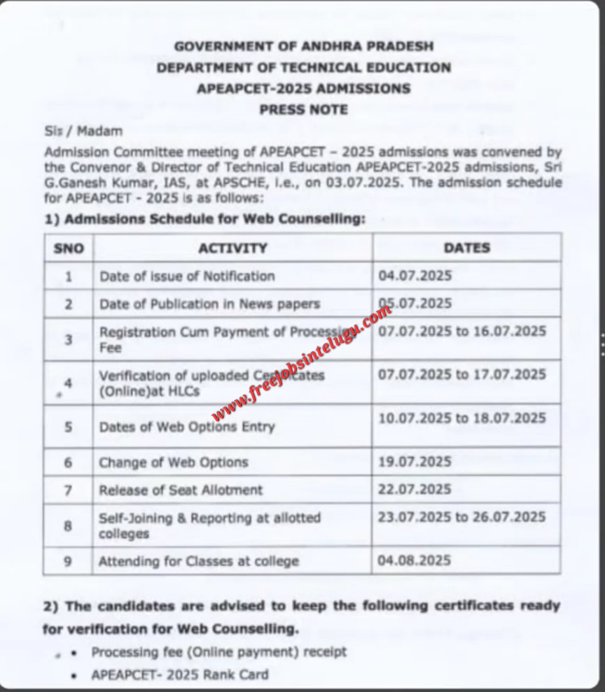 Note: పైన తెలిపిన షెడ్యూల్ అధికారికంగా విడుదల చేసింది. విద్యార్థులు ఆ షెడ్యూల్ ప్రకారం ఏపీ ఎంసెట్ కౌన్సిలింగ్ కు హాజరుకాగలరు.