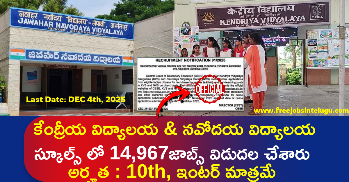 సెంట్రల్ బోర్డ్ ఆఫ్ సెకండరీ ఎడ్యుకేషన్ డిపార్ట్మెంట్ (CBSE) వారు కేంద్రీయ విద్యాలయ మరియు నవోదయ విద్యాలయ పాఠశాలలో ఖాళీగా ఉన్నటువంటి టీచింగ్ మరియు నాన్ టీచింగ్ పోస్టులను భర్తీ చేయడానికి ఈరోజు అధికారికంగా నోటిఫికేషన్ జారీ చేశారు. మొత్తం 14,967 పైగా టీచింగ్ మరియు నాన్ టీచింగ్ పోస్టులను ఈ కంబైన్డ్ నోటిఫికేషన్ ద్వారా భర్తీ చేయనున్నారు. టెన్త్, ఇంటర్మీడియట్ , డిగ్రీ మరియు ఇతర అర్హతలు కలిగిన ప్రతి ఒక్కరు కూడా ఈ ఉద్యోగాలకు దరఖాస్తు చేసుకోవడానికి అవకాశం ఉంటుంది. నవంబర్ 14, 2025 నుండి డిసెంబర్ 4, 2025వ తేదీ వరకు ఈ ఉద్యోగాలకు ఆన్లైన్లో దరఖాస్తు చేసుకోవడానికి అవకాశం ఉంటుంది. ఈ నోటిఫికేషన్ లోని పూర్తి సమాచారాన్ని ఇప్పుడు చూద్దాం.