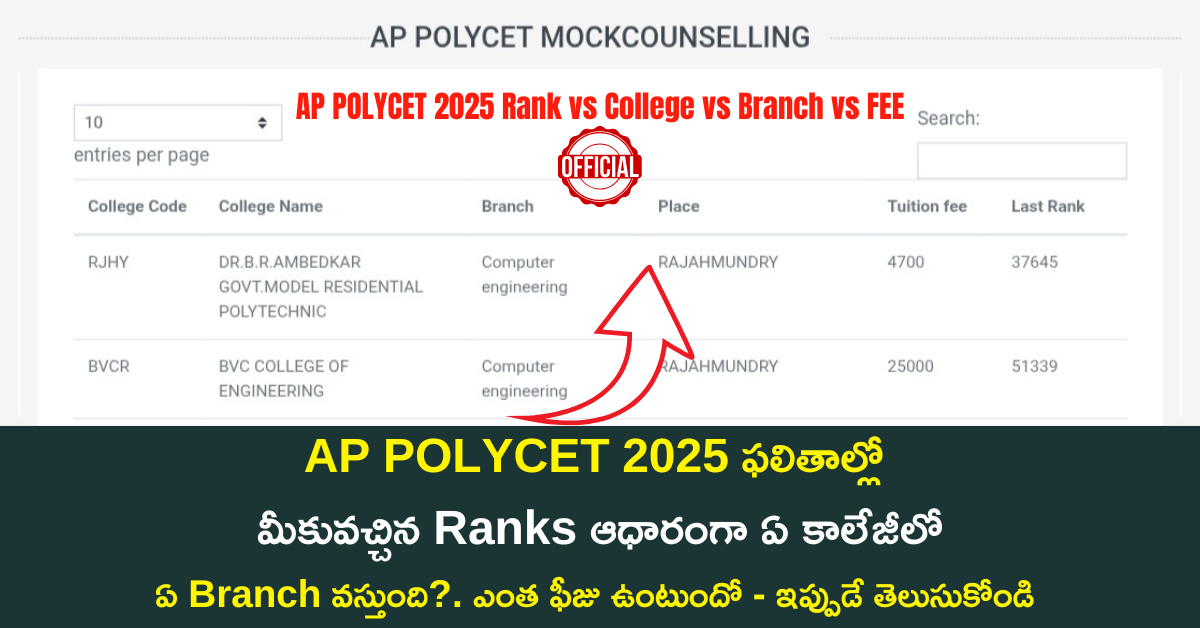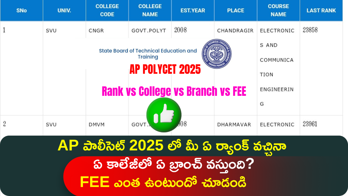 AP Polycet 2025 Rank vs College vs Branch vs Fee: మీకు వచ్చిన ర్యాంకు ఏ కాలేజీలో ఏ బ్రాంచ్ వస్తుంది, ఫీజు ఎంత ఉంటుందో తెలుసుకోండి.